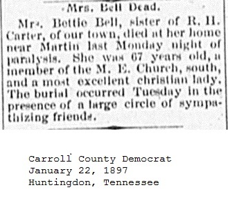 Carroll County Democrat 1897 Newspaper Clippings, Surnames A-B Carroll County, TNGenWeb Images may not display in alphabetical order. Use the Back and Next buttons below the image window to navigate. Betty Bell Image 19 of 45 Carroll County Democrat January 22, 1897 - Huntingdon-Tennessee