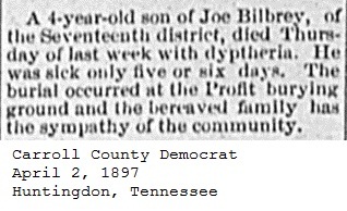 Carroll County Democrat 1897 Newspaper Clippings, Surnames A-B Carroll County, TNGenWeb Images may not display in alphabetical order. Use the Back and Next buttons below the image window to navigate. Son of Joe Bilbrey Image 24 of 45 Carroll County Democrat April 2, 1897 - Huntingdon-Tennessee