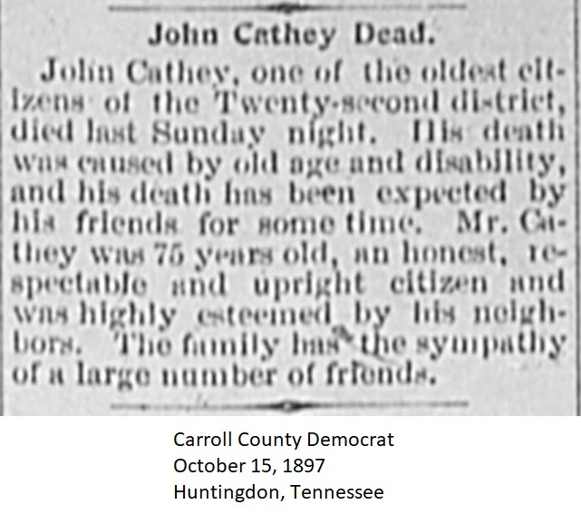 Carroll County Democrat 1897 Newspaper Clippings, Surnames C-E Carroll County, TNGenWeb Images may not display in alphabetical order. Use the Back and Next buttons below the image window to navigate. Cathey-John_Carroll-County-Democrat-October-15-1897-Huntingdon-Tennessee Image 10 of 67
