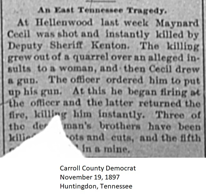 Carroll County Democrat 1897 Newspaper Clippings, Surnames C-E Carroll County, TNGenWeb Images may not display in alphabetical order. Use the Back and Next buttons below the image window to navigate. Cecil-Maynard_Carroll-County-Democrat-November-19-1897-Huntingdon-Tennessee Image 11 of 67