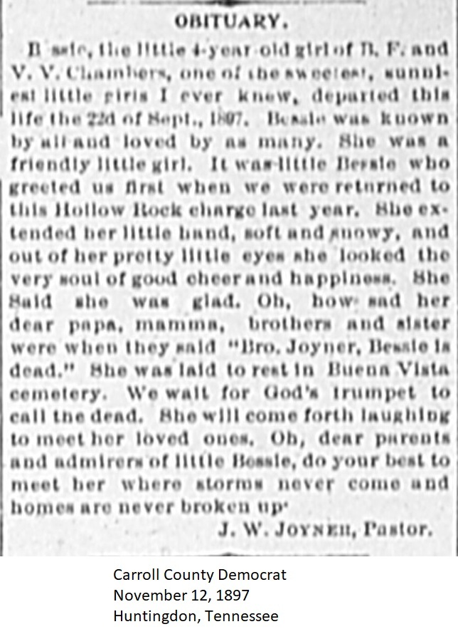 Carroll County Democrat 1897 Newspaper Clippings, Surnames C-E Carroll County, TNGenWeb Images may not display in alphabetical order. Use the Back and Next buttons below the image window to navigate. Chambers-Bessie_Carroll-County-Democrat-November-12-1897-Huntingdon-Tennessee Image 12 of 67