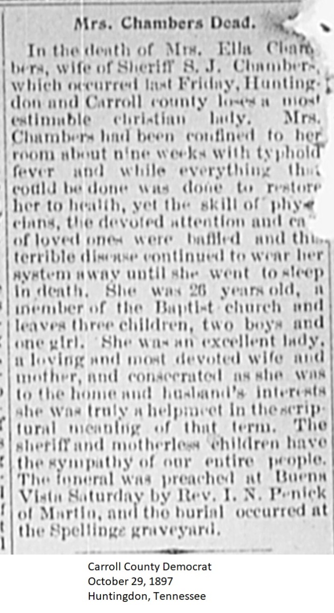 Carroll County Democrat 1897 Newspaper Clippings, Surnames C-E Carroll County, TNGenWeb Images may not display in alphabetical order. Use the Back and Next buttons below the image window to navigate. Chambers-Ella_Carroll-County-Democrat-October-29-1897-Huntingdon-Tennessee Image 14 of 67