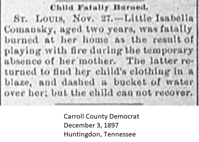 Carroll County Democrat 1897 Newspaper Clippings, Surnames C-E Carroll County, TNGenWeb Images may not display in alphabetical order. Use the Back and Next buttons below the image window to navigate. Comansky-Isabella_Carroll-County-Democrat-December-3-1897-Huntingdon-Tennessee Image 24 of 67
