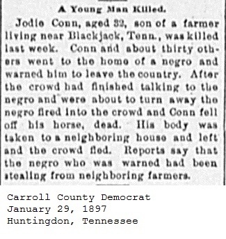 Carroll County Democrat 1897 Newspaper Clippings, Surnames C-E Carroll County, TNGenWeb Images may not display in alphabetical order. Use the Back and Next buttons below the image window to navigate. Conn-Jodie_Carroll-County-Democrat-January-29-1897-Huntingdon-Tennessee Image 28 of 67