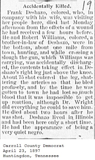 Carroll County Democrat 1897 Newspaper Clippings, Surnames C-E Carroll County, TNGenWeb Images may not display in alphabetical order. Use the Back and Next buttons below the image window to navigate. Deahazo-Frank_Carroll-County-Democrat-April-23-1897-Huntingdon-Tennessee Image 47 of 67