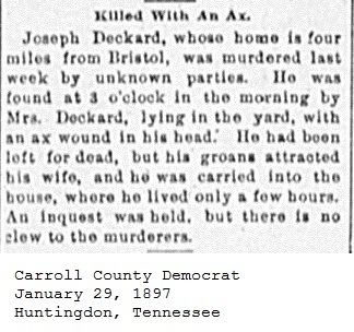 Carroll County Democrat 1897 Newspaper Clippings, Surnames C-E Carroll County, TNGenWeb Images may not display in alphabetical order. Use the Back and Next buttons below the image window to navigate. Deckard-Joseph_Carroll-County-Democrat-January-29-1897-Huntingdon-Tennessee Image 46 of 67