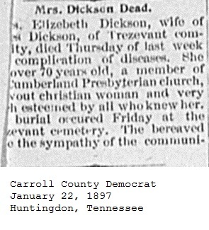Carroll County Democrat 1897 Newspaper Clippings, Surnames C-E Carroll County, TNGenWeb Images may not display in alphabetical order. Use the Back and Next buttons below the image window to navigate. Dickson-Elizabeth_Carroll-County-Democrat-January-22-1897-Huntingdon-Tennessee Image 50 of 67