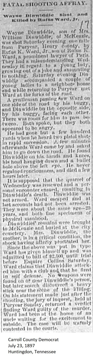 Carroll County Democrat 1897 Newspaper Clippings, Surnames C-E Carroll County, TNGenWeb Images may not display in alphabetical order. Use the Back and Next buttons below the image window to navigate. Dinwiddle-Wayne_Carroll-County-Democrat-July-23-1897-Huntingdon-Tennessee Image 53 of 67