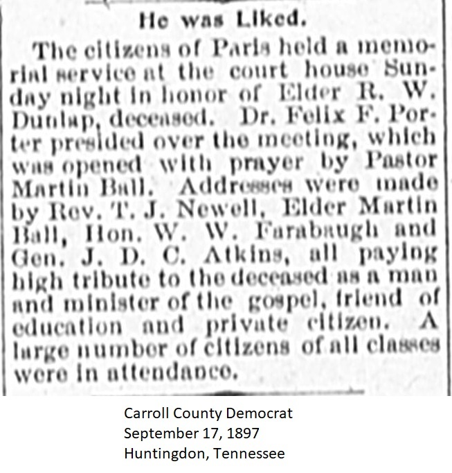 Carroll County Democrat 1897 Newspaper Clippings, Surnames C-E Carroll County, TNGenWeb Images may not display in alphabetical order. Use the Back and Next buttons below the image window to navigate. Dunlap-R.-W._Carroll-County-Democrat-September-17-1897-Huntingdon-Tennessee Image 61 of 67