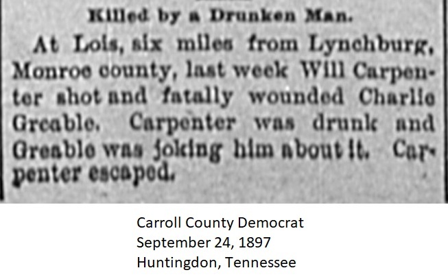Carroll County Democrat 1897 Newspaper Clippings, Surnames F-I Carroll County, TNGenWeb Images may not display in alphabetical order. Use the Back and Next buttons below the image window to navigate. Greable-Charlie_Carroll-County-Democrat-September-24-1897-Huntingdon-Tennessee Image 14 of 60