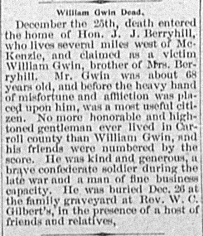 Carroll County Democrat 1897 Newspaper Clippings, Surnames F-I Carroll County, TNGenWeb Images may not display in alphabetical order. Use the Back and Next buttons below the image window to navigate. Gwin-Williams_Carroll-County-Democrat-January-8-1897-Huntingdon-Tennessee Image 19 of 60