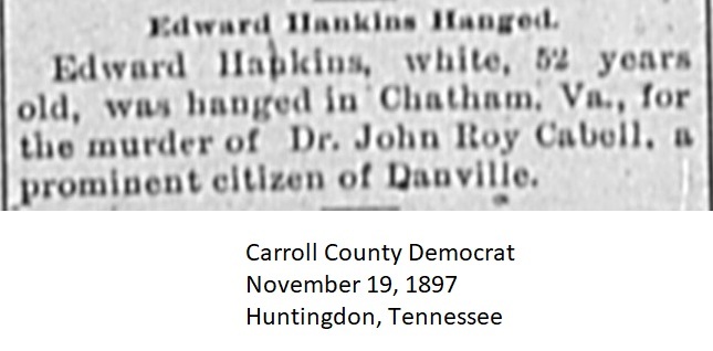 Carroll County Democrat 1897 Newspaper Clippings, Surnames F-I Carroll County, TNGenWeb Images may not display in alphabetical order. Use the Back and Next buttons below the image window to navigate. Hankins-Edward_Carroll-County-Democrat-November-19-1897-Huntingdon-Tennessee Image 24 of 60