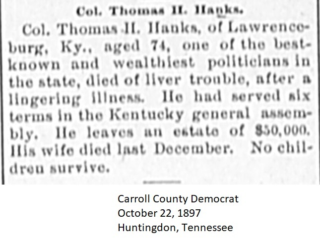 Carroll County Democrat 1897 Newspaper Clippings, Surnames F-I Carroll County, TNGenWeb Images may not display in alphabetical order. Use the Back and Next buttons below the image window to navigate. Hanks-Thomas-H._Carroll-County-Democrat-October-22-1897-Huntingdon-Tennessee Image 25 of 60