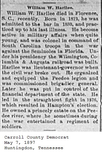 Carroll County Democrat 1897 Newspaper Clippings, Surnames F-I Carroll County, TNGenWeb Images may not display in alphabetical order. Use the Back and Next buttons below the image window to navigate. Harllee-William-W._Carroll-County-Democrat-May-7-1897-Huntingdon-Tennessee Image 27 of 60