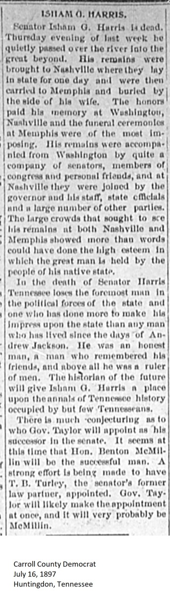 Carroll County Democrat 1897 Newspaper Clippings, Surnames F-I Carroll County, TNGenWeb Images may not display in alphabetical order. Use the Back and Next buttons below the image window to navigate. Harris-Isham-G._Carroll-County-Democrat-July-16-1897-Huntingdon-Tennessee_3 Image 32 of 60