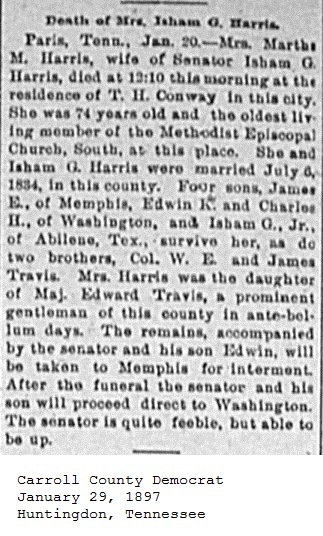 Carroll County Democrat 1897 Newspaper Clippings, Surnames F-I Carroll County, TNGenWeb Images may not display in alphabetical order. Use the Back and Next buttons below the image window to navigate. Harris-Martha-M._Carroll-County-Democrat-January-29-1897-Huntingdon-Tennessee Image 31 of 60