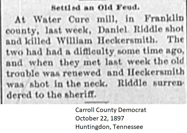 Carroll County Democrat 1897 Newspaper Clippings, Surnames F-I Carroll County, TNGenWeb Images may not display in alphabetical order. Use the Back and Next buttons below the image window to navigate. Heckersmith-William_Carroll-County-Democrat-October-22-1897-Huntingdon-Tennessee Image 37 of 60