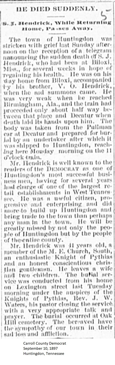 Carroll County Democrat 1897 Newspaper Clippings, Surnames F-I Carroll County, TNGenWeb Images may not display in alphabetical order. Use the Back and Next buttons below the image window to navigate. Hendrick-S.-J._Carroll-County-Democrat-September-10-1897-Huntingdon-Tennessee Image 38 of 60