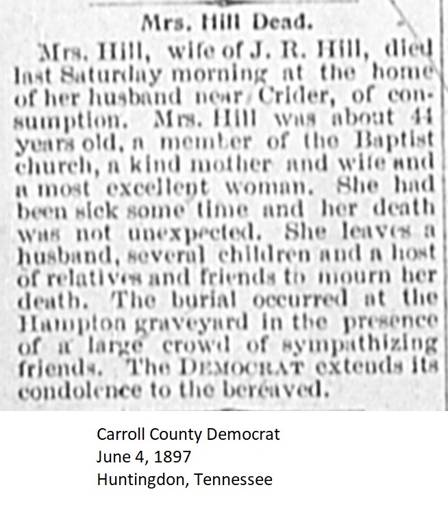 Carroll County Democrat 1897 Newspaper Clippings, Surnames F-I Carroll County, TNGenWeb Images may not display in alphabetical order. Use the Back and Next buttons below the image window to navigate. Hill_Carroll-County-Democrat-June-4-1897-Huntingdon-Tennessee Image 42 of 60