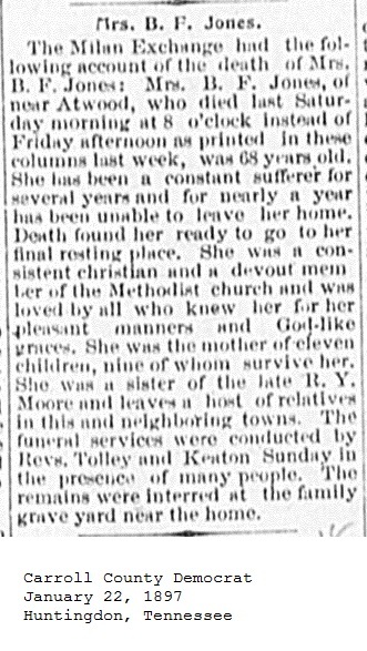 Carroll County Democrat 1897 Newspaper Clippings, Surnames J-L Carroll County, TNGenWeb Images may not display in alphabetical order. Use the Back and Next buttons below the image window to navigate. Jones_Carroll-County-Democrat-January-22-1897-Huntingdon-Tennessee Image 12 of 35