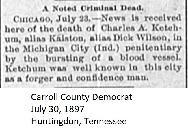 Carroll County Democrat 1897 Newspaper Clippings, Surnames J-L Carroll County, TNGenWeb Images may not display in alphabetical order. Use the Back and Next buttons below the image window to navigate. Ketchum-Charles-A._Carroll-County-Democrat-July-30-1897-Huntingdon-Tennessee Image 17 of 35
