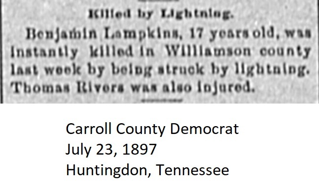 Carroll County Democrat 1897 Newspaper Clippings, Surnames J-L Carroll County, TNGenWeb Images may not display in alphabetical order. Use the Back and Next buttons below the image window to navigate. Lampkins-Benjamin_Carroll-County-Democrat-July-23-1897-Huntingdon-Tennessee Image 21 of 35