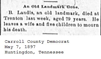 Carroll County Democrat 1897 Newspaper Clippings, Surnames J-L Carroll County, TNGenWeb Images may not display in alphabetical order. Use the Back and Next buttons below the image window to navigate. Landis-B._Carroll-County-Democrat-May-7-1897-Huntingdon-Tennessee Image 23 of 35