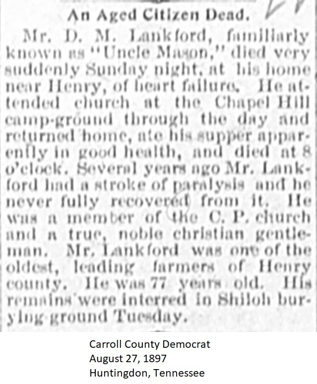 Carroll County Democrat 1897 Newspaper Clippings, Surnames J-L Carroll County, TNGenWeb Images may not display in alphabetical order. Use the Back and Next buttons below the image window to navigate. Lankford-D.-M._Carroll-County-Democrat-August-27-1897-Huntingdon-Tennessee Image 24 of 35