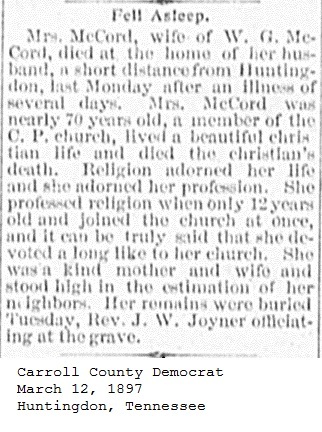Carroll County Democrat 1897 Newspaper Clippings, Surnames M-O Carroll County, TNGenWeb Images may not display in alphabetical order. Use the Back and Next buttons below the image window to navigate. McCord_Carroll-County-Democrat-March-12-1897-Huntingdon-Tennessee Image 13 of 49