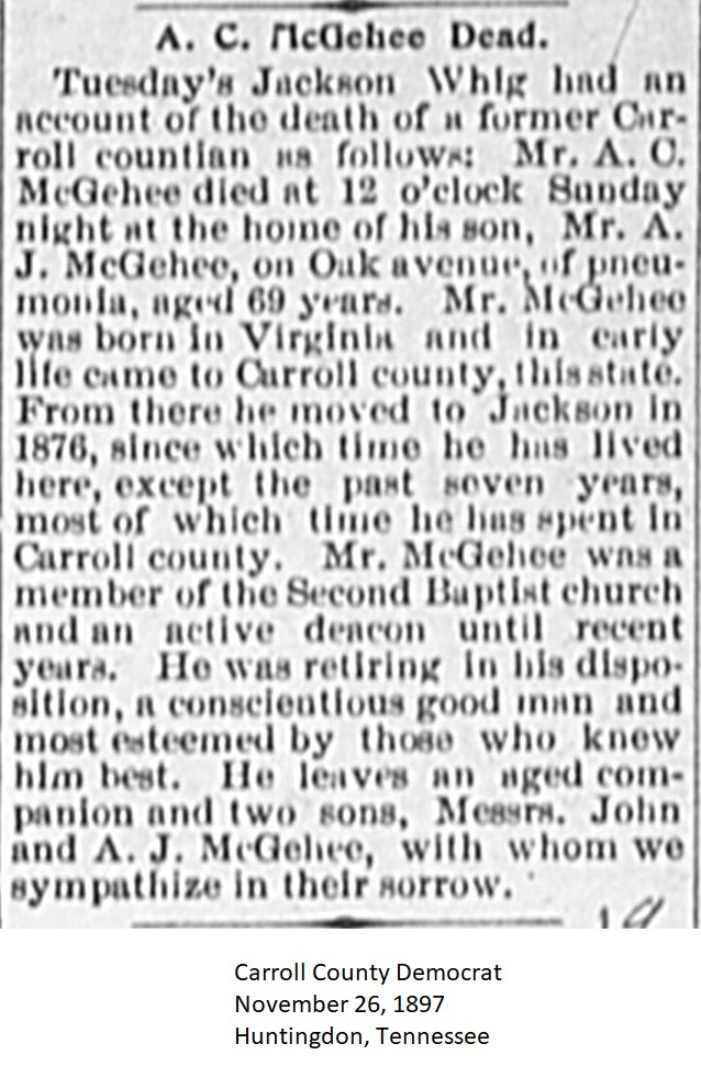 Carroll County Democrat 1897 Newspaper Clippings, Surnames M-O Carroll County, TNGenWeb Images may not display in alphabetical order. Use the Back and Next buttons below the image window to navigate. McGehee-A.-C._Carroll-County-Democrat-November-26-1897-Huntingdon-Tennessee Image 17 of 49