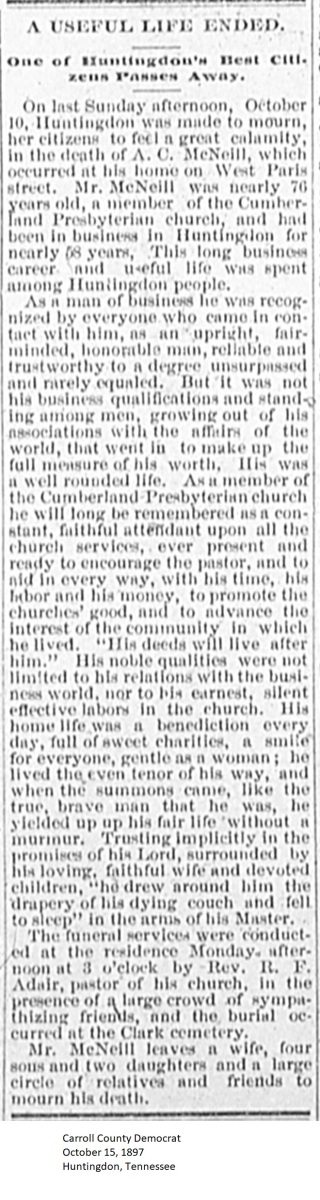 Carroll County Democrat 1897 Newspaper Clippings, Surnames M-O Carroll County, TNGenWeb Images may not display in alphabetical order. Use the Back and Next buttons below the image window to navigate. McNeill-A.-C._Carroll-County-Democrat-October-15-1897-Huntingdon-Tennessee Image 25 of 49