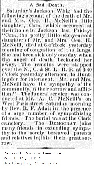 Carroll County Democrat 1897 Newspaper Clippings, Surnames M-O Carroll County, TNGenWeb Images may not display in alphabetical order. Use the Back and Next buttons below the image window to navigate. McNeill-Cora_Carroll-County-Democrat-March-19-1897-Huntingdon-Tennessee Image 20 of 49