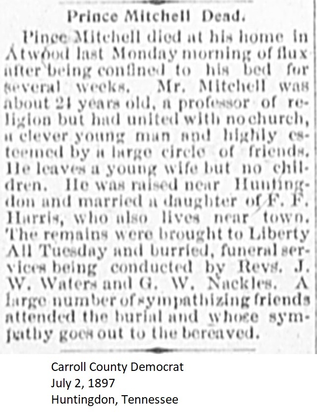 Carroll County Democrat 1897 Newspaper Clippings, Surnames M-O Carroll County, TNGenWeb Images may not display in alphabetical order. Use the Back and Next buttons below the image window to navigate. Mitchell-Prince_Carroll-County-Democrat-July-2-1897-Huntingdon-Tennessee Image 27 of 49