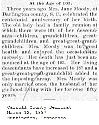 Carroll County Democrat 1897 Newspaper Clippings, Surnames M-O Carroll County, TNGenWeb Images may not display in alphabetical order. Use the Back and Next buttons below the image window to navigate. Moody-Jane_Carroll-County-Democrat-March-12-1897-Huntingdon-Tennessee Image 29 of 49