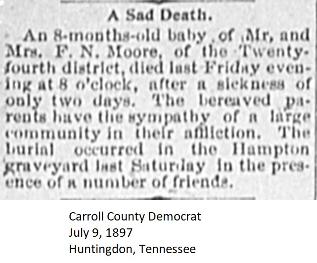 Carroll County Democrat 1897 Newspaper Clippings, Surnames M-O Carroll County, TNGenWeb Images may not display in alphabetical order. Use the Back and Next buttons below the image window to navigate. Moore_Carroll-County-Democrat-July-9-1897-Huntingdon-Tennessee Image 35 of 49