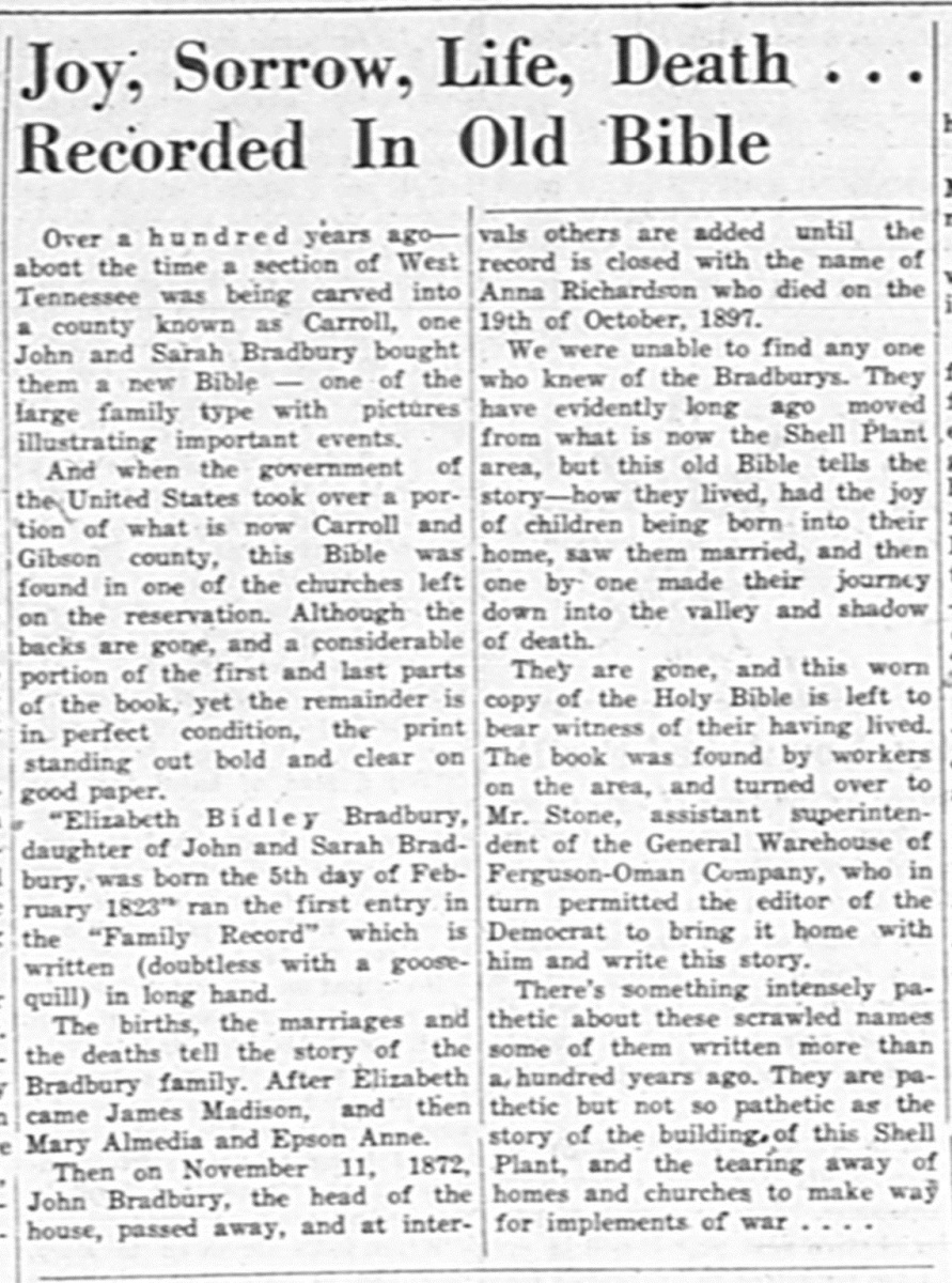 Carroll County Democrat 1941 Newspaper Clippings Carroll County, TNGenWeb Images may not display in alphabetical order. Use the Back and Next buttons below the image window to navigate. Bradbury-Bible_Carroll-County-Democrat-August-22-1941-Huntingdon-Tennessee Image 13 of 24
