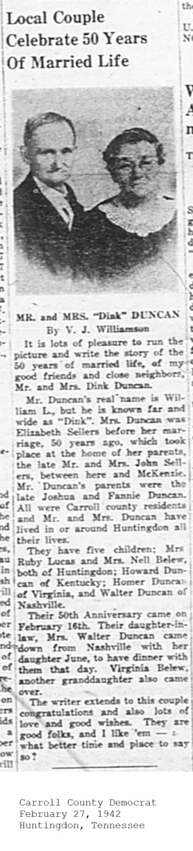 Carroll County Democrat 1942 Newspaper Clippings Carroll County, TNGenWeb Images may not display in alphabetical order. Use the Back and Next buttons below the image window to navigate. Duncan-William-L.-Elizabeth_Carroll-County-Democrat-February-27-1942-Huntingdon-Tennessee Image 22 of 65