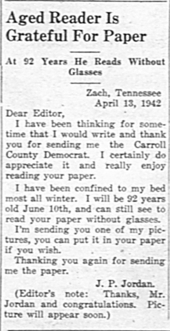 Carroll County Democrat 1942 Newspaper Clippings Carroll County, TNGenWeb Images may not display in alphabetical order. Use the Back and Next buttons below the image window to navigate. Jordan-J.-P._Carroll-County-Democrat-April-17-1942-Huntingdon-Tennessee Image 28 of 65