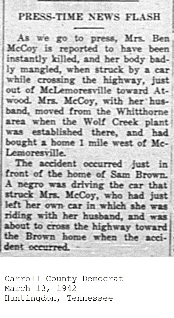 Carroll County Democrat 1942 Newspaper Clippings Carroll County, TNGenWeb Images may not display in alphabetical order. Use the Back and Next buttons below the image window to navigate. McCoy_Carroll-County-Democrat-March-13-1942-Huntingdon-Tennessee Image 37 of 65