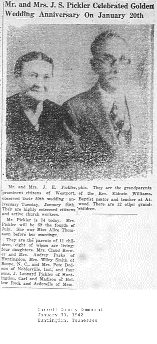 Carroll County Democrat 1942 Newspaper Clippings Carroll County, TNGenWeb Images may not display in alphabetical order. Use the Back and Next buttons below the image window to navigate. Pickler-J.E.-Alice_Carroll-County-Democrat-January-30-1942-Huntingdon-Tennessee Image 51 of 65