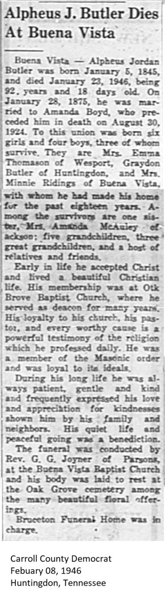 Carroll County Democrat 1946 Newspaper Clippings, Surnames A-L Carroll County, TNGenWeb Images may not display in alphabetical order. Use the Back and Next buttons below the image window to navigate. Butler-Alpheus-J_Carroll-County-Democrat-February-08-1946-Huntingdon-Tennessee Image 17 of 69