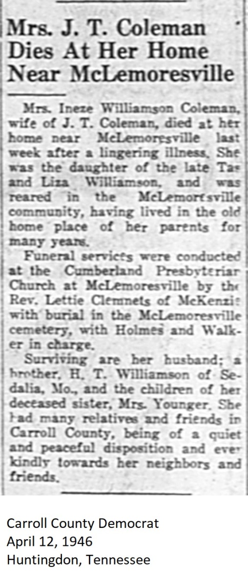 Carroll County Democrat 1946 Newspaper Clippings, Surnames A-L Carroll County, TNGenWeb Images may not display in alphabetical order. Use the Back and Next buttons below the image window to navigate. Coleman-Ineze-Williamson_Carroll-County-Democrat-April-12-1946-Huntingdon-Tennessee Image 25 of 69