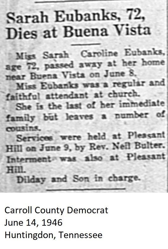 Carroll County Democrat 1946 Newspaper Clippings, Surnames A-L Carroll County, TNGenWeb Images may not display in alphabetical order. Use the Back and Next buttons below the image window to navigate. Eubanks-Sarah-Caroline_Carroll-County-Democrat-June-14-1946-Huntingdon-Tennessee Image 39 of 69