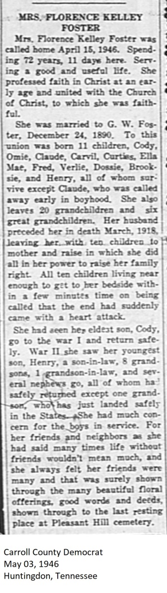 Carroll County Democrat 1946 Newspaper Clippings, Surnames A-L Carroll County, TNGenWeb Images may not display in alphabetical order. Use the Back and Next buttons below the image window to navigate. Foster-Florence-Kelly_Carroll-County-Democrat-May-03-1946-Huntingdon-Tennessee Image 45 of 69