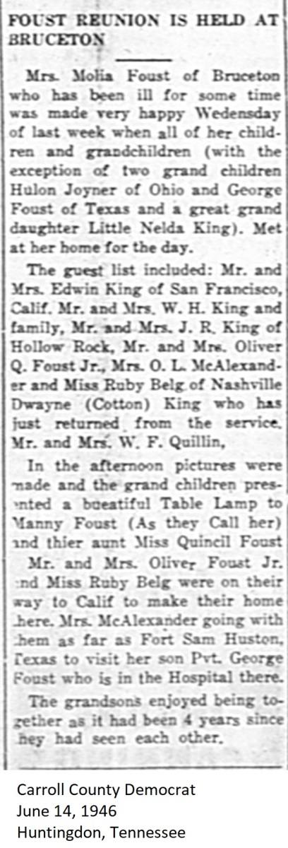 Carroll County Democrat 1946 Newspaper Clippings, Surnames A-L Carroll County, TNGenWeb Images may not display in alphabetical order. Use the Back and Next buttons below the image window to navigate. Foust-Reunion_Carroll-County-Democrat-June-14-1946-Huntingdon-Tennessee Image 44 of 69