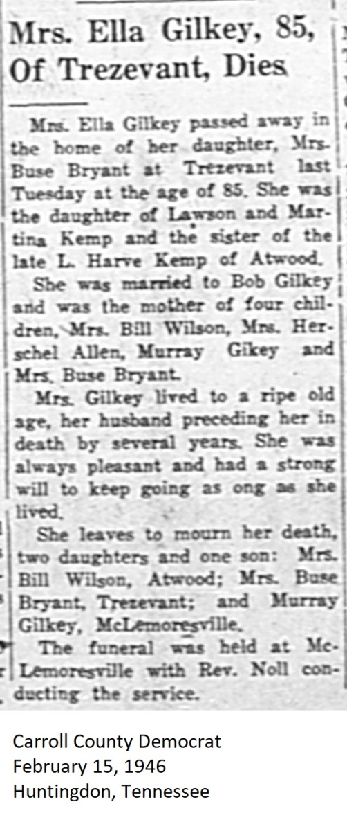 Carroll County Democrat 1946 Newspaper Clippings, Surnames A-L Carroll County, TNGenWeb Images may not display in alphabetical order. Use the Back and Next buttons below the image window to navigate. Gilkey-Ella_Carroll-County-Democrat-February-15-1946-Huntingdon-Tennessee Image 48 of 69