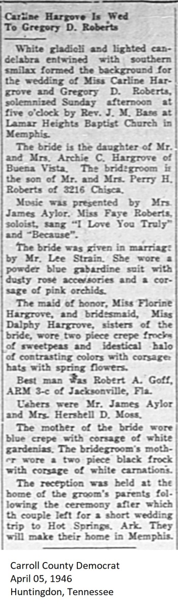 Carroll County Democrat 1946 Newspaper Clippings, Surnames A-L Carroll County, TNGenWeb Images may not display in alphabetical order. Use the Back and Next buttons below the image window to navigate. Hargrove-and-Roberts-wedding_Carroll-County-Democrat-April-05-1946-Huntingdon-Tennessee Image 52 of 69