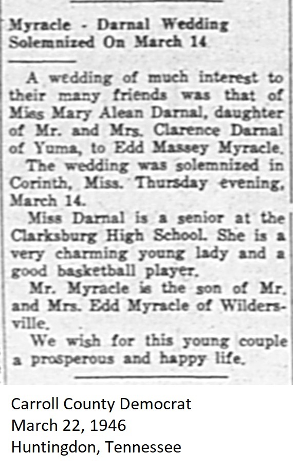 Carroll County Democrat 1946 Newspaper Clippings, Surnames M-Z Carroll County, TNGenWeb Images may not display in alphabetical order. Use the Back and Next buttons below the image window to navigate. Myracle-and-Darnal-Wedding_Carroll-County-Democrat-March-22-1946-Huntingdon-Tennessee Image 15 of 56