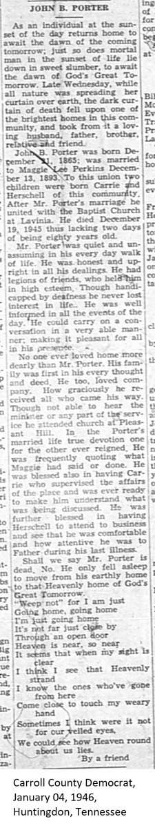 Carroll County Democrat 1946 Newspaper Clippings, Surnames M-Z Carroll County, TNGenWeb Images may not display in alphabetical order. Use the Back and Next buttons below the image window to navigate. Porter-John-B._Carroll-County-Democrat-January-04-1946-Huntingdon-Tennessee Image 29 of 56