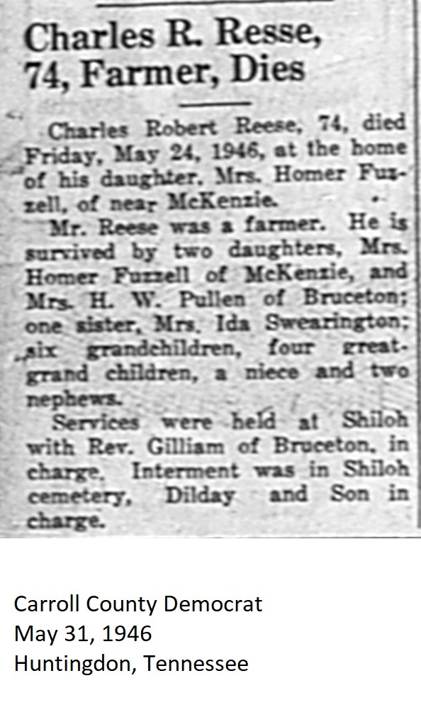 Carroll County Democrat 1946 Newspaper Clippings, Surnames M-Z Carroll County, TNGenWeb Images may not display in alphabetical order. Use the Back and Next buttons below the image window to navigate. Reese.-Charles-R._Carroll-County-Democrat-May-31-1946-Huntingdon-Tennessee Image 28 of 56